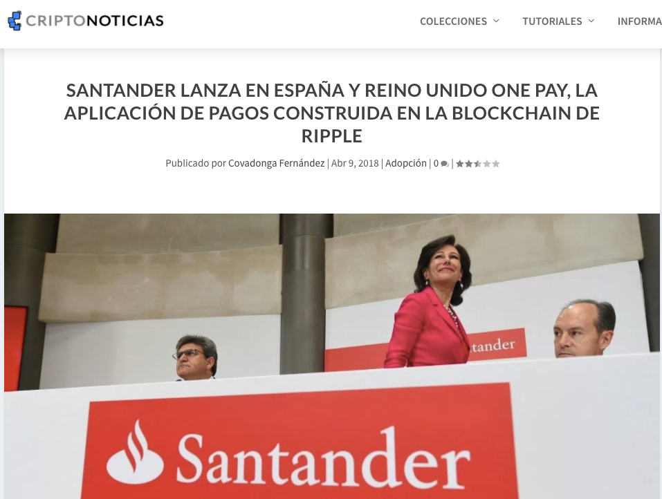 Blockchain cambia la manera de producir información. La presidenta Ana Botín anunció hoy en su perfil de Twitter el lanzamiento de One Pay, la aplicación de pagos Blockchain construida en Ripple. La noticia la publiqué hace dos días en CriptoNoticias, el diario del que soy corresponsal en España y que dirige el ingeniero Héctor Cárdenas. Esta exclusiva, como la Propuesta de Resolución del Parlamento Europeo sobre tecnologías de contabilidad distribuida y blockchains, que publiqué en febrero, las conseguí y escribí desde el ordenador de mi casa.